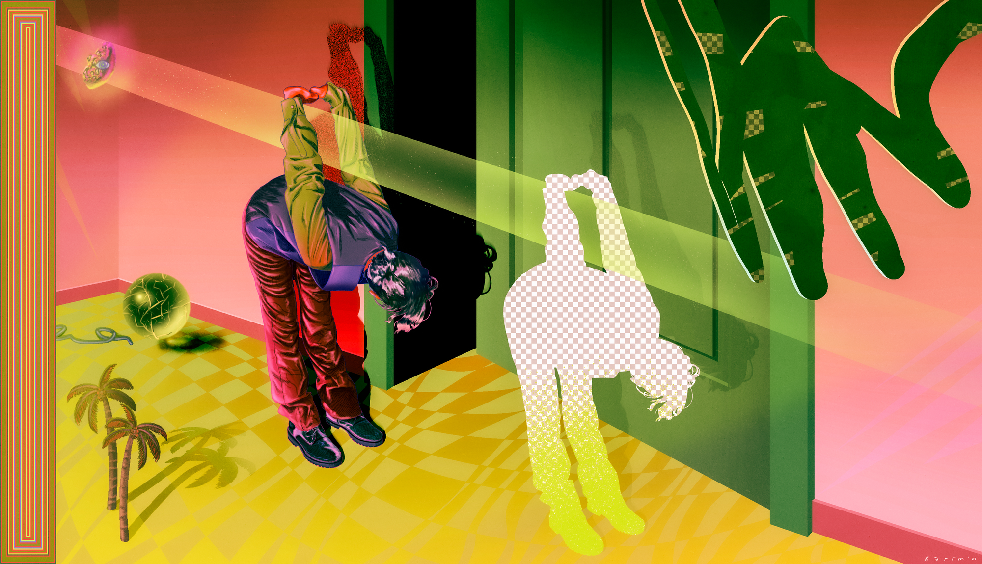 At the core of Karim's artistic vision lies the philosophy of Albert Camus' Absurdism. This existential perspective challenges the human condition, and Karim translates it into vibrant visual form. The vivid colors that permeate their works collide with figures caught in the throes of inexplicable poses, creating a paradoxical sense of both depression and fascination. In this juxtaposition of unrelated objects and elements, Karim opens doors to fresh interpretations, inviting the audience to embark on a journey through the labyrinthine corridors of their art.