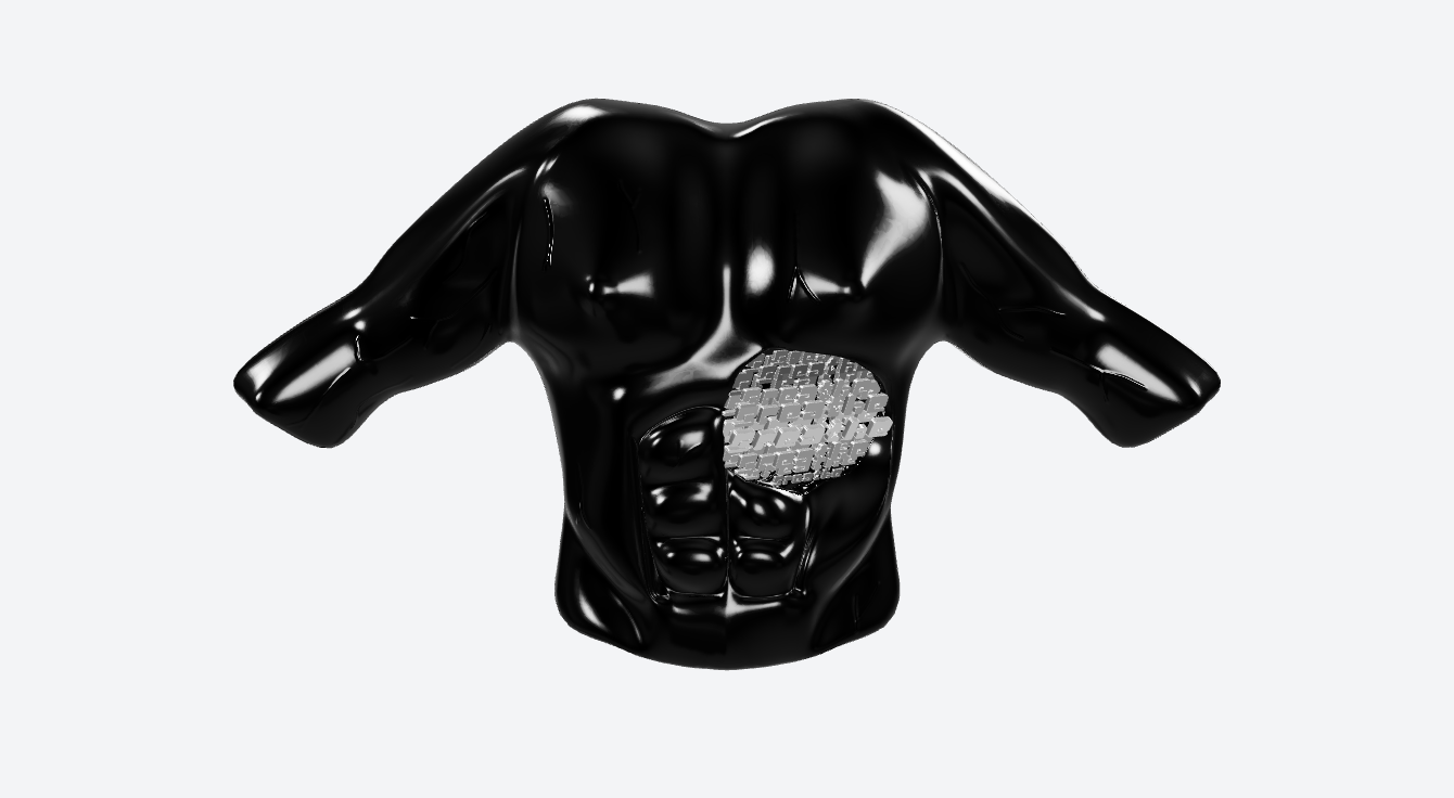 This sculpted torso recalls classical sculptures. Unlike antiquities, though, this piece reminds the viewer to breathe, with the word “breathe” repeated in silver script expanding and contracting out of the gaping hole in the torso’s chest, depicting the physical act of breathing. If viewed from the right angle, you can literally see into the sculpture's chest.