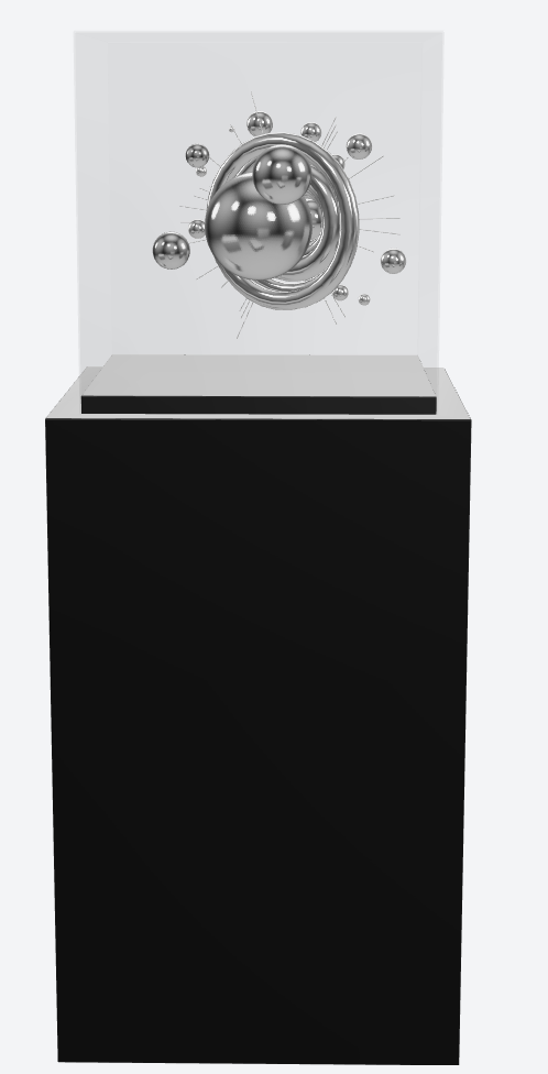I adore Arc Mikkelson’s abstract, silver sculpture. I appreciate how he designed the piece on a black plinth with a clear case, equating it to how it would be shown in the traditional art world. Unlike physical sculptures, though, this piece floats and moves on its own.