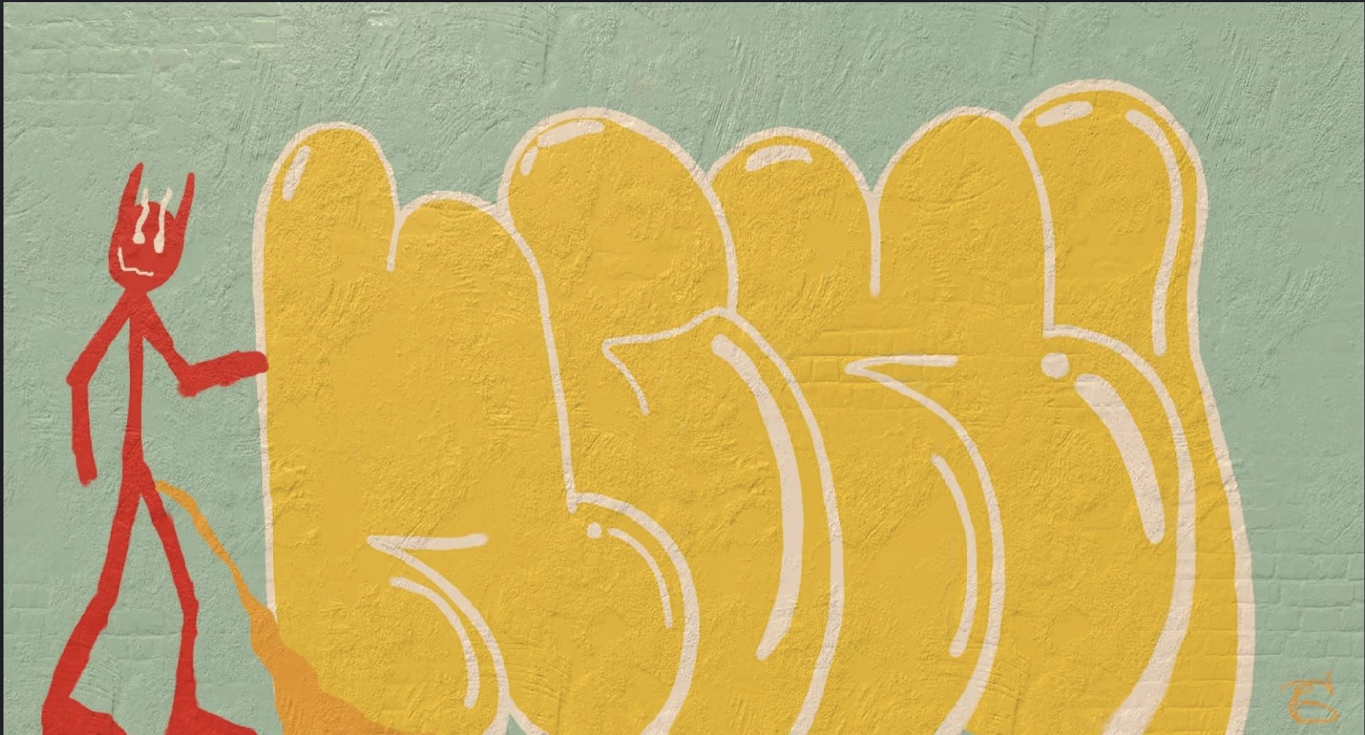 In this composition we can see a wide range of materials, including spray paint, markers, and stencils. Those are all characteristic for graffiti art.
