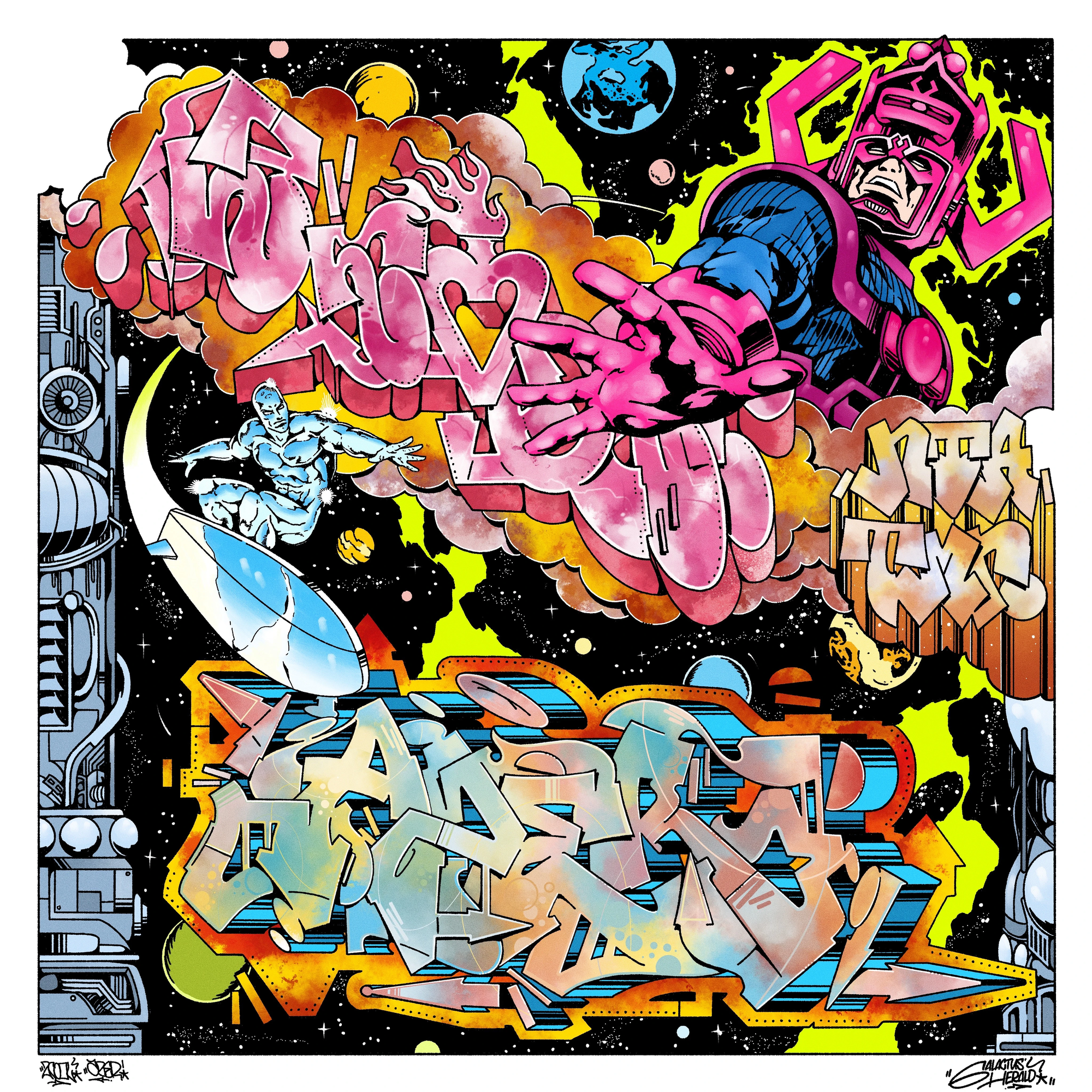Galactus' Herald, a beautiful composition filled with details, bold colors, tags, figures and dynamic postures is what makes this artwork worth of appreciations.