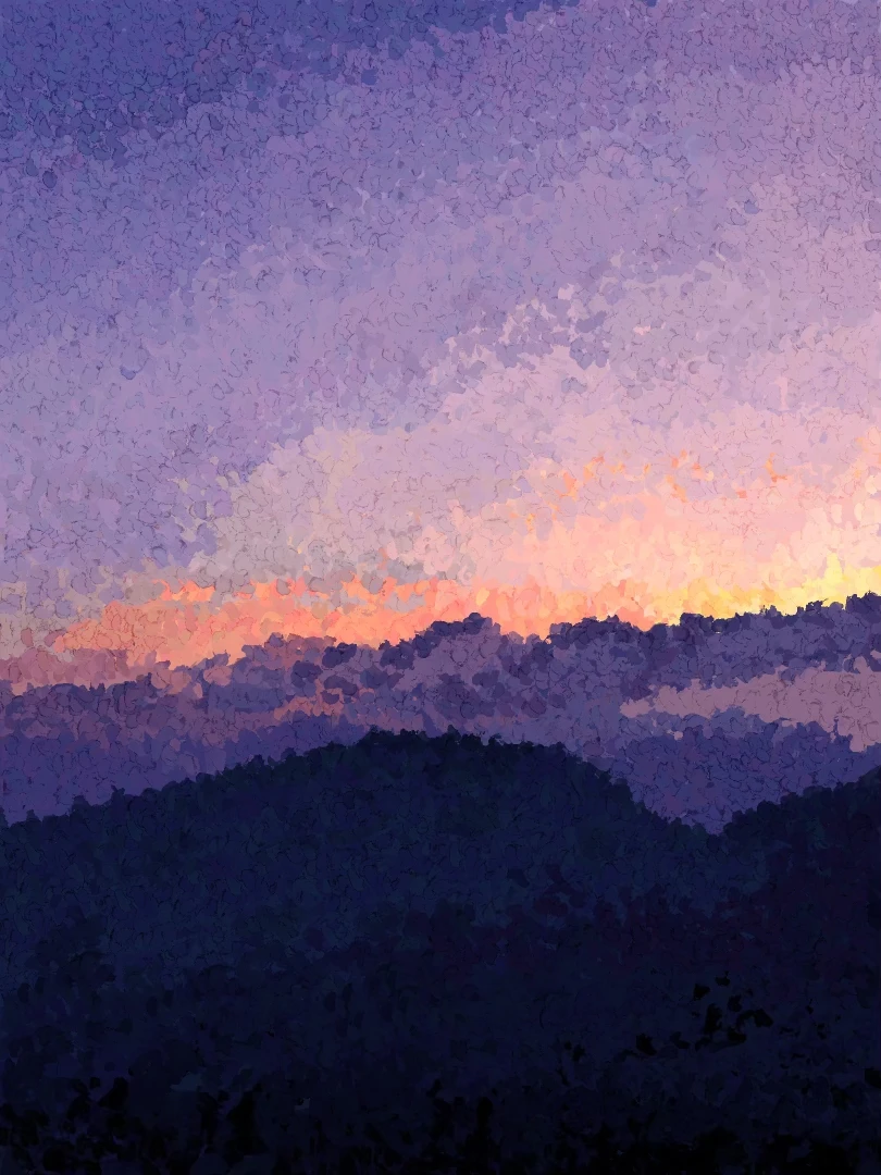 This artwork called purple mountain by SaintAngelical captures the atmosphere and mood of the scene. Including vibrant, bold colors, such as pinks, oranges, and purples, which are often associated with sunsets, this image creates a certain serenity.