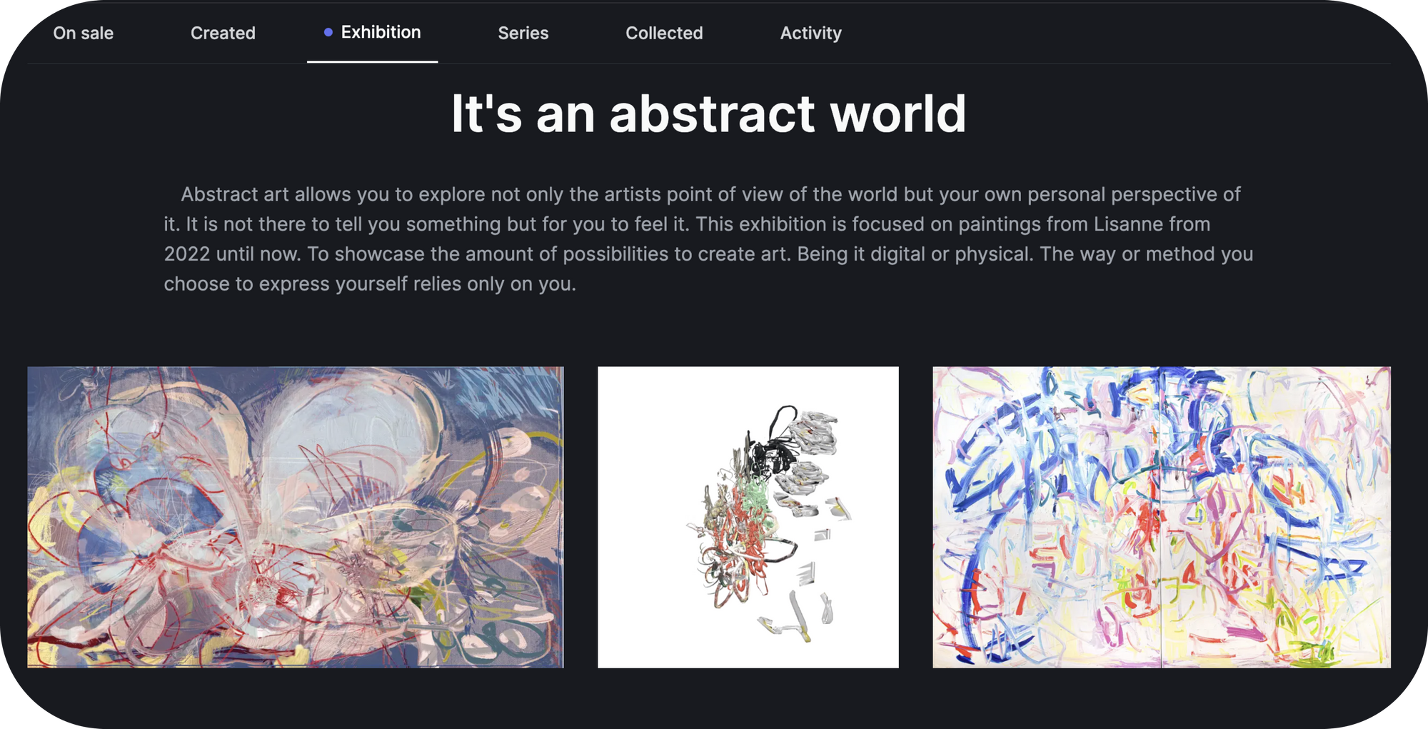 They are embedded in your profile and for everyone to see. Curate weekly shows by artists you love, build your own portfolio or simply have fun by showing off your prized art collection. Infinite combinations for infinite opportunities!