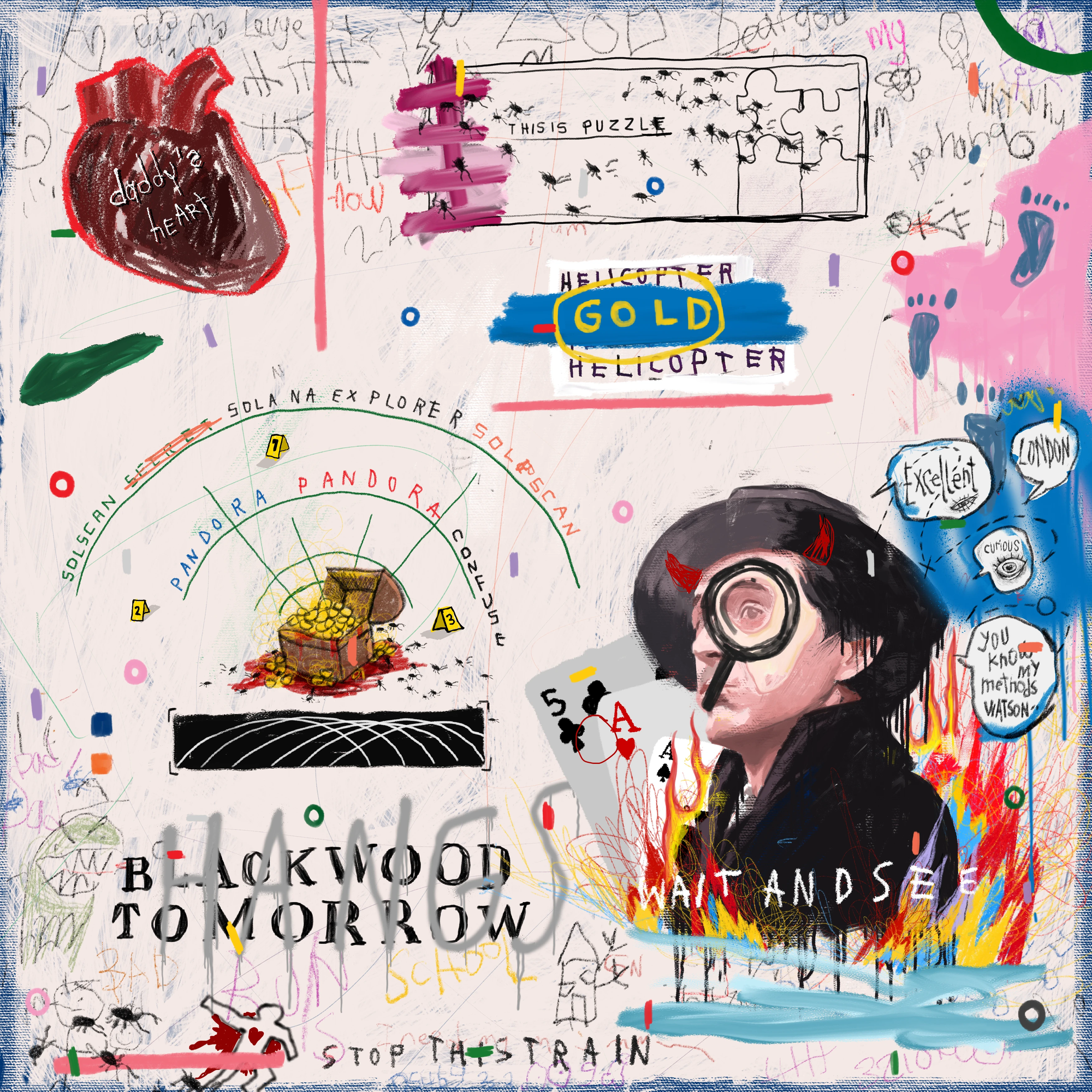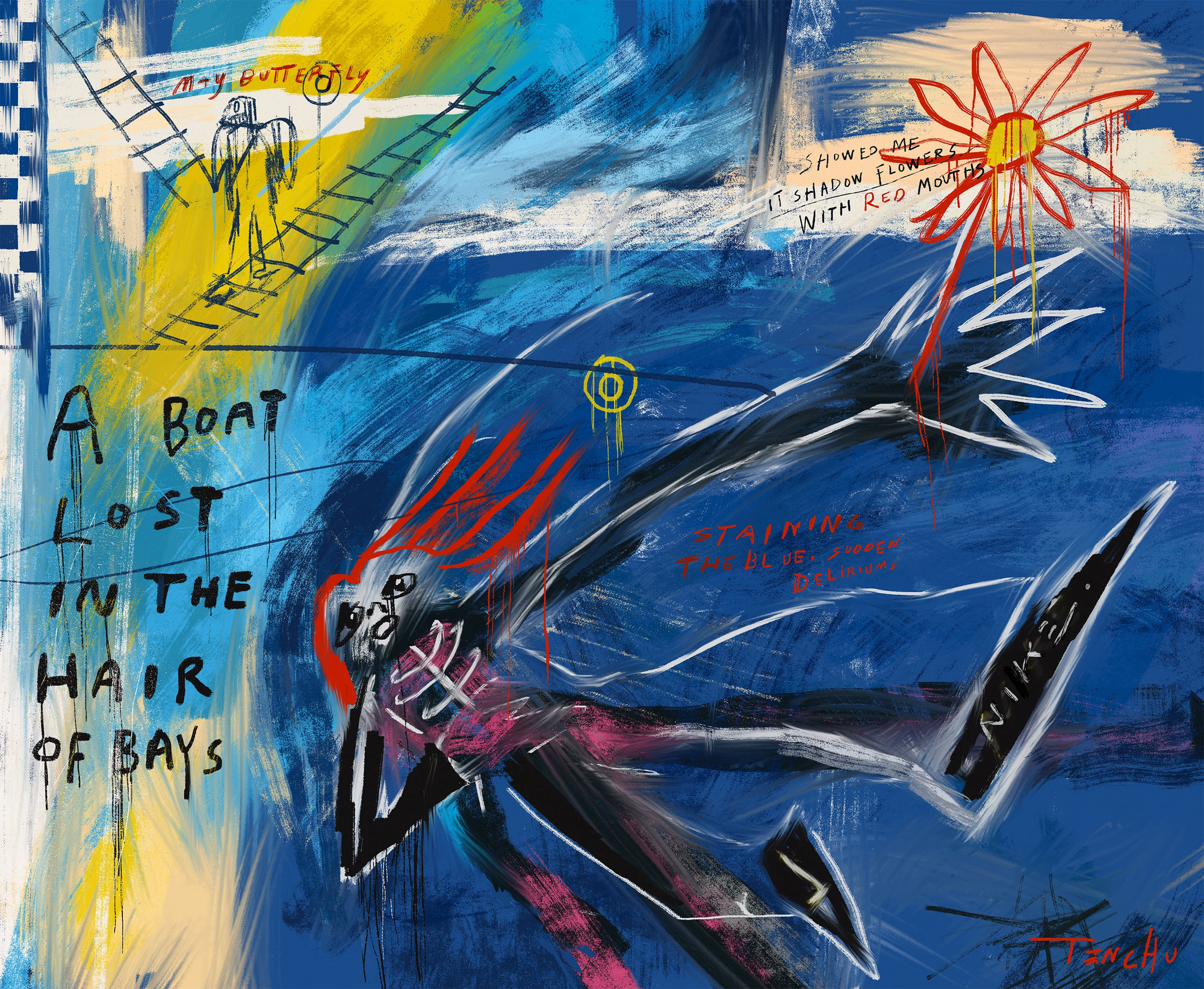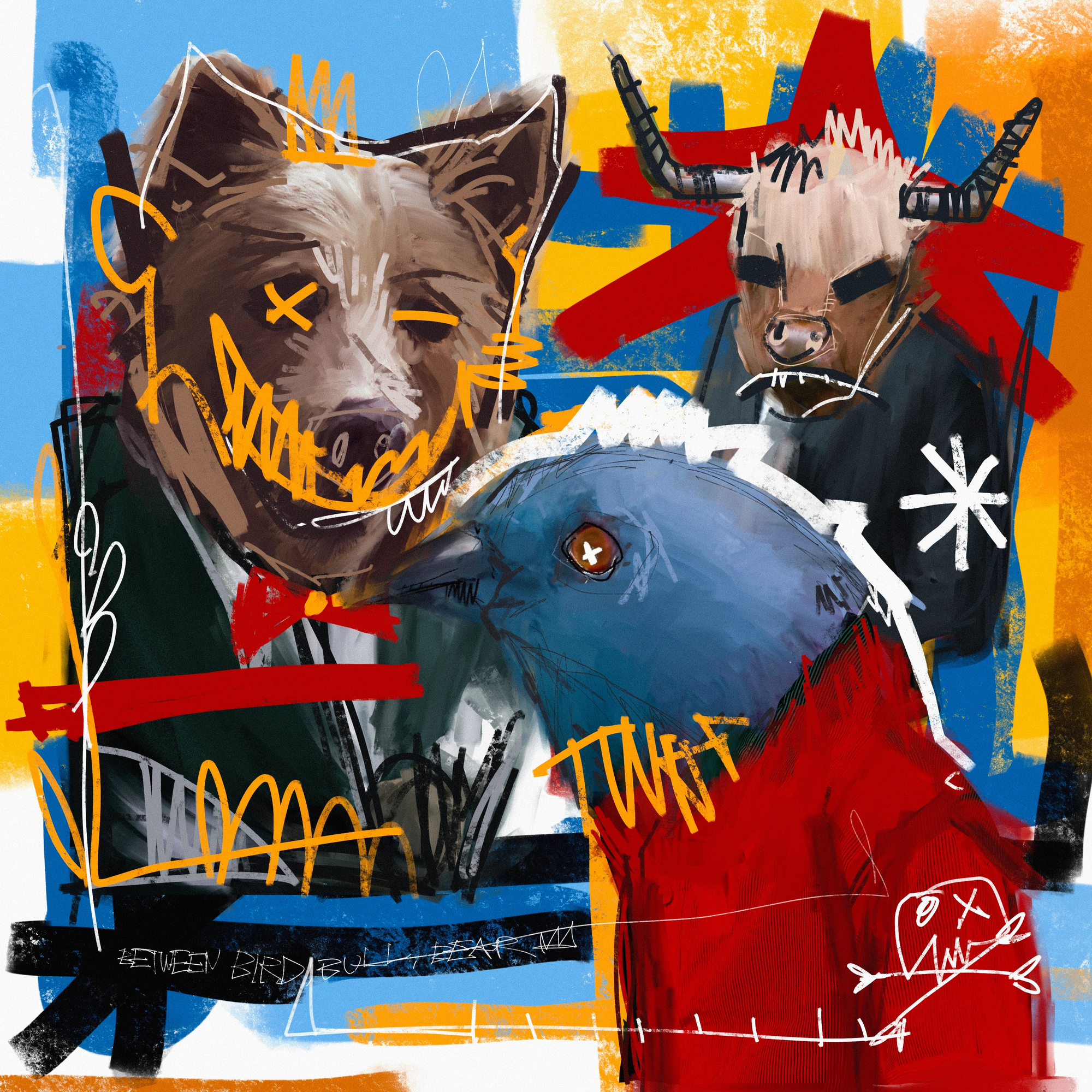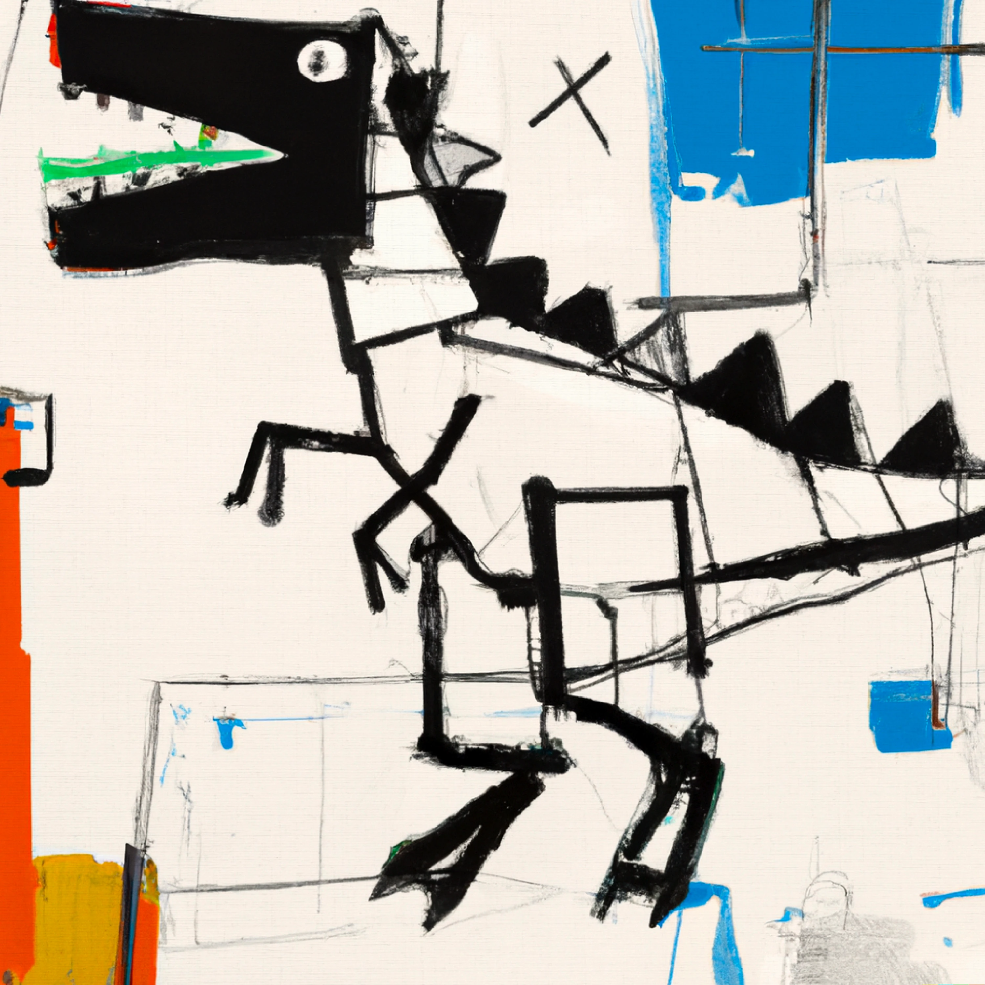 This composition combines elements of graffiti, street art, and neo-expressionism, creating an interesting visual language.