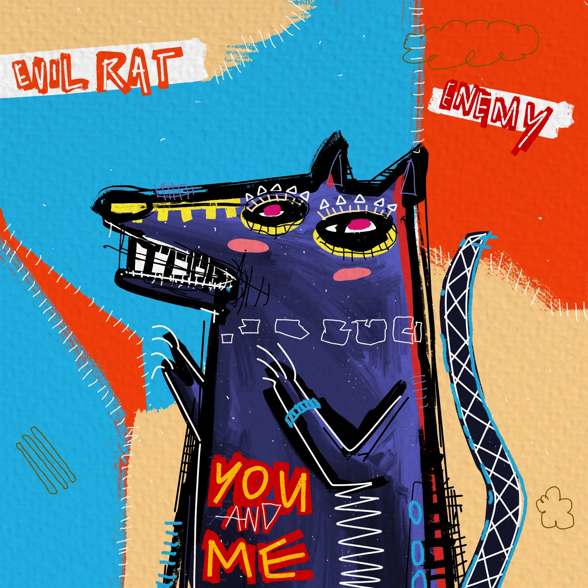 Evil Rat combines words that convey social and political commentary and a figure with strong visual impact.