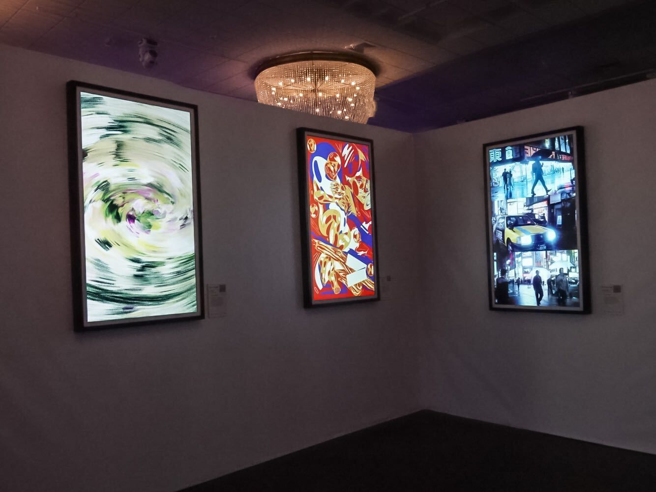In this installation of digital abstract art in a living room, we wanted to convey how collectors can live with digital art in their home. Paintings by Lisanne Haack, ADHD, Kiramoto, and Vincenzo were displayed in this modern living room.