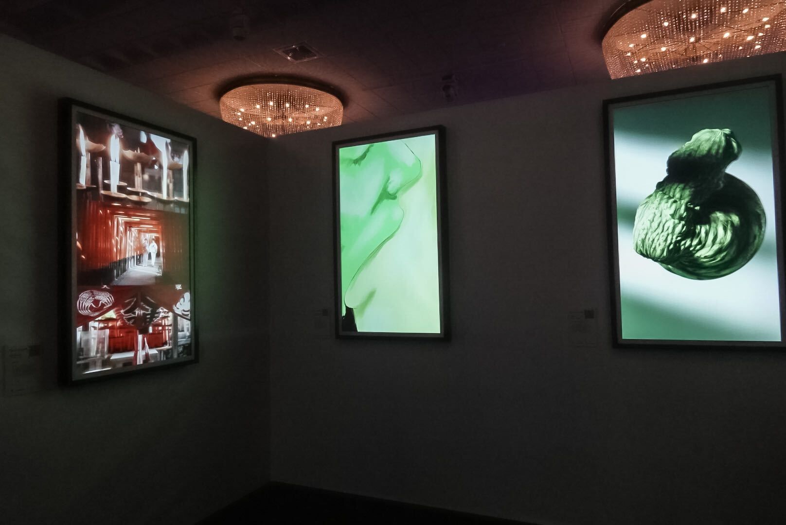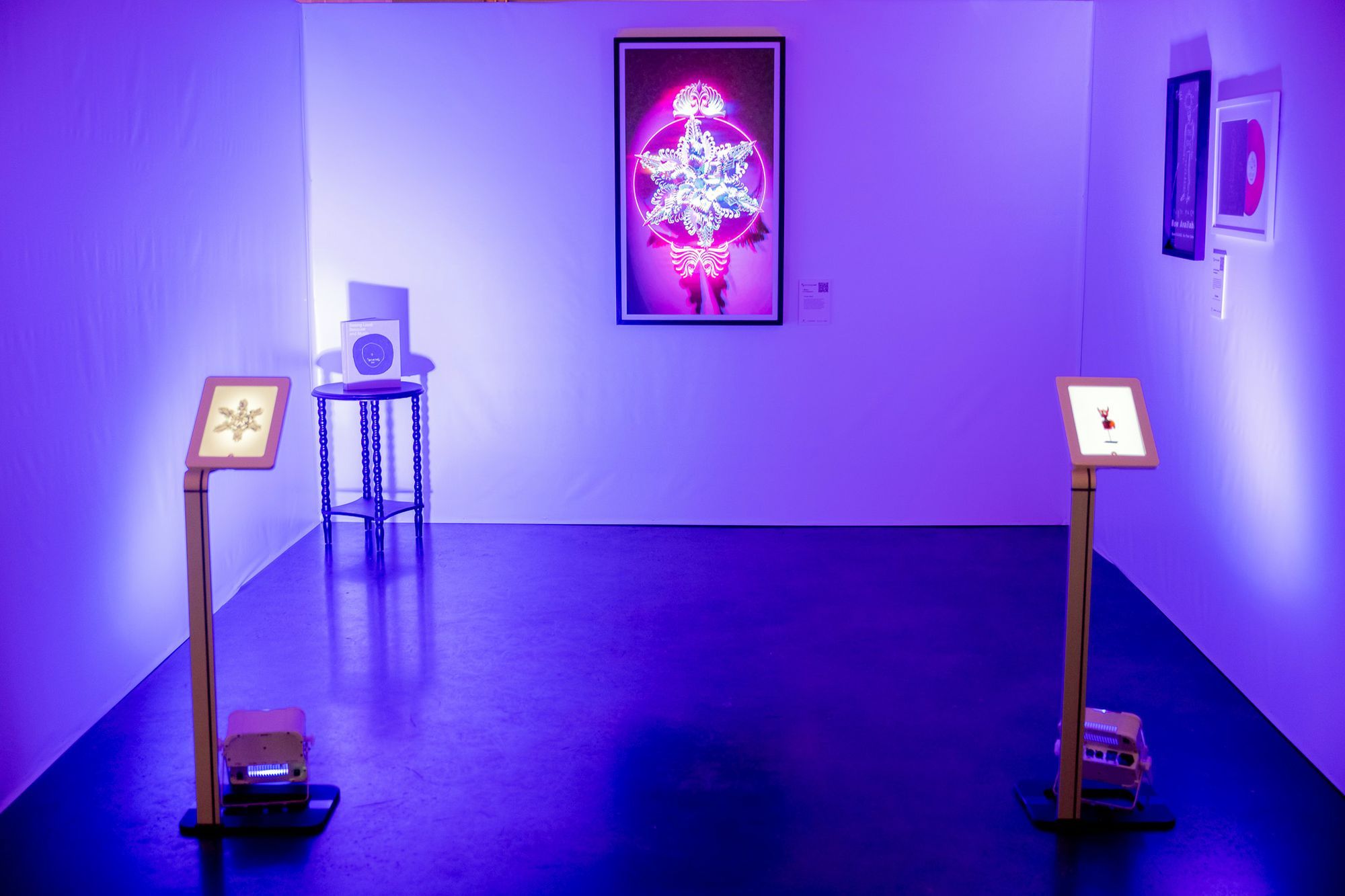 The sculpture gallery featured Mueo's NeoBaroque Snowflakes and Peanug's Sacred by Nature sculptures displayed on iPads, so visitors could manipulate and engage with the works.