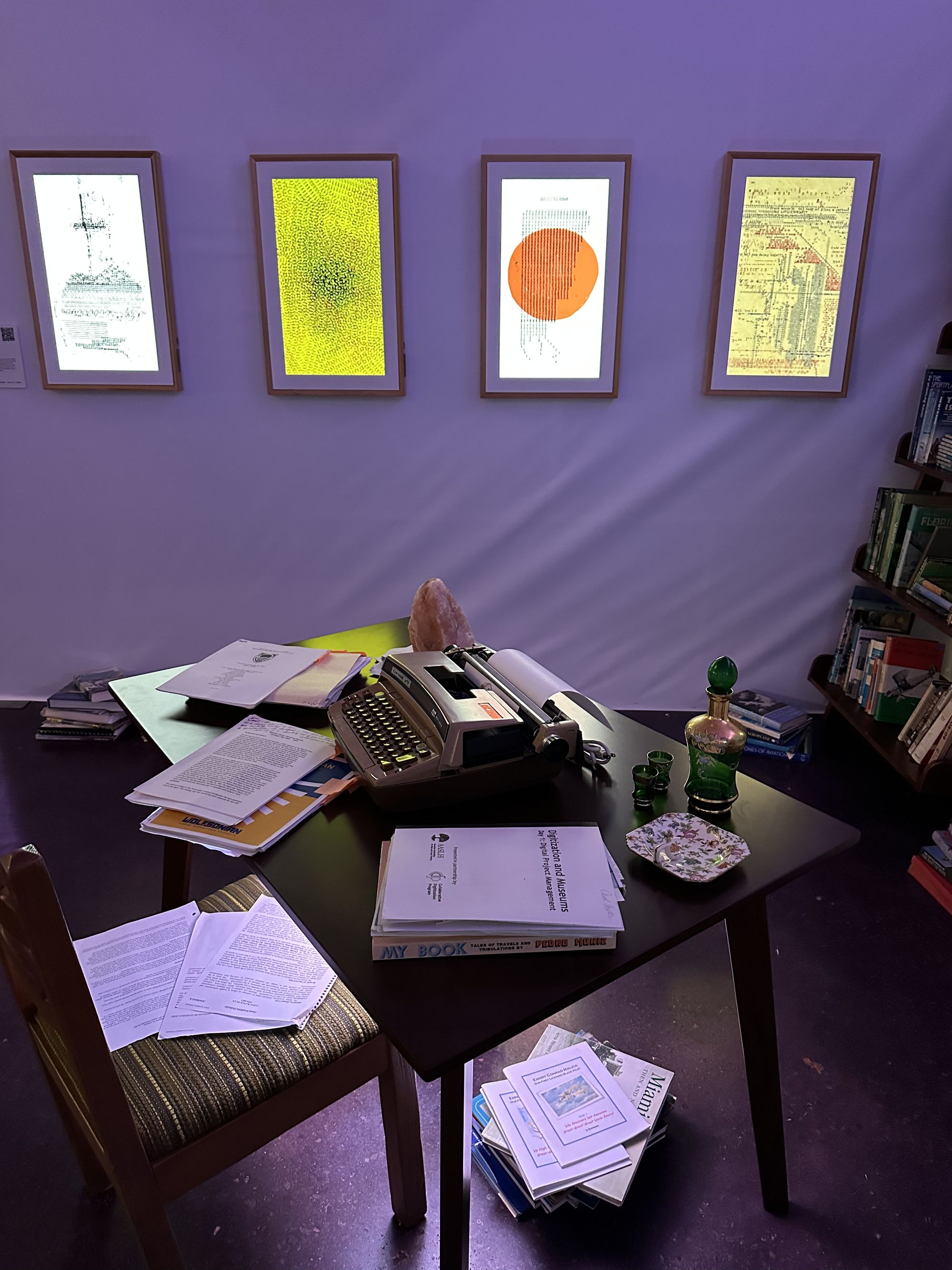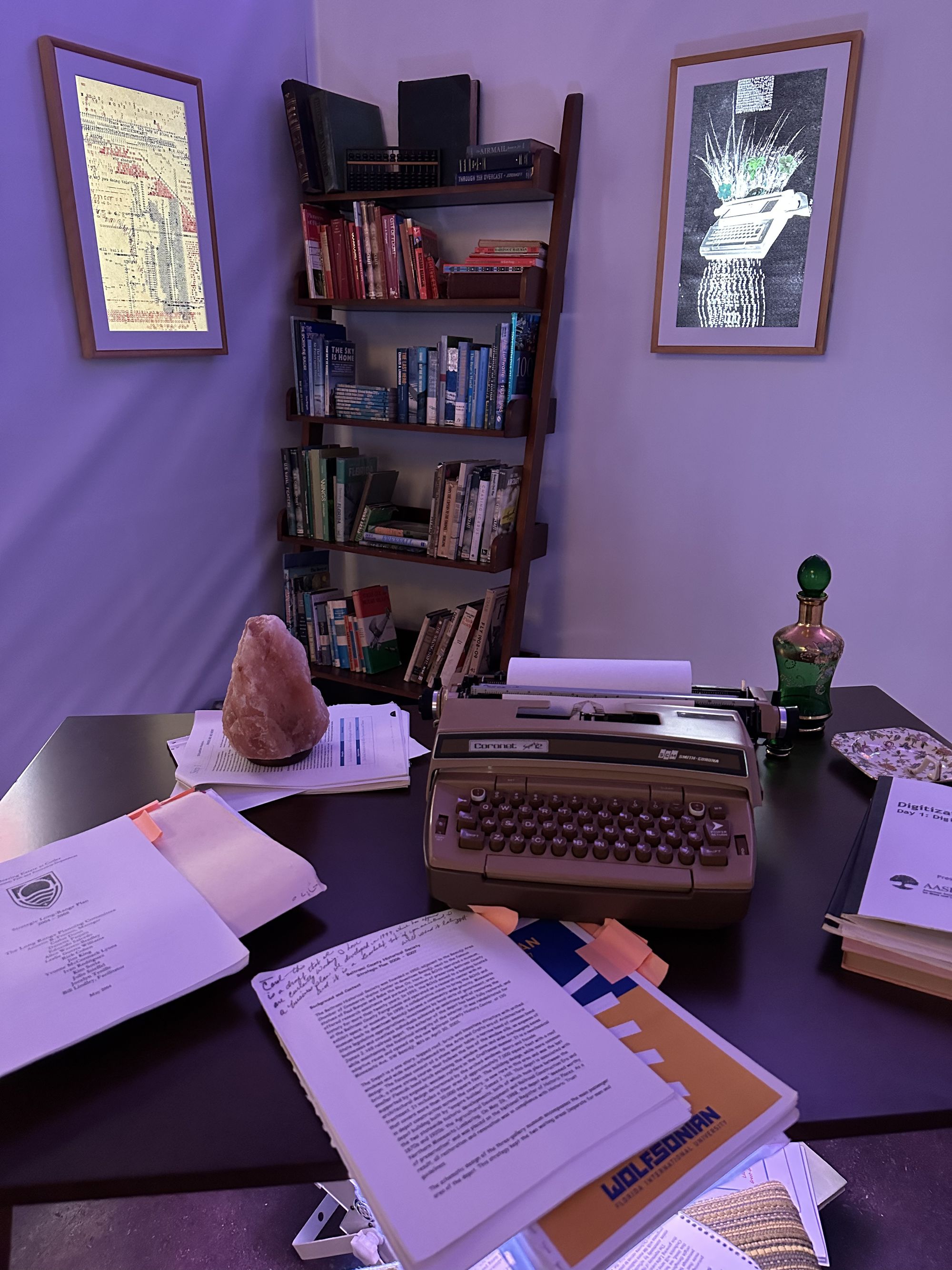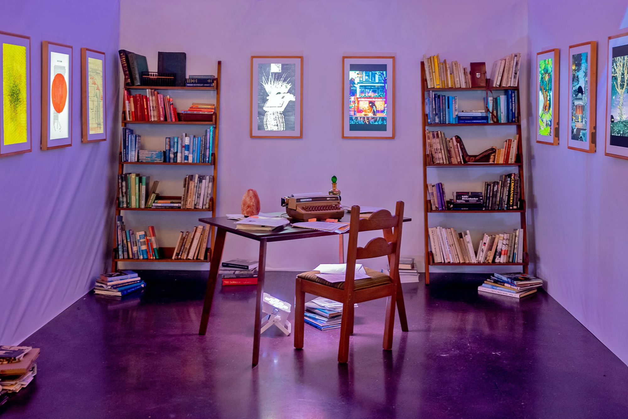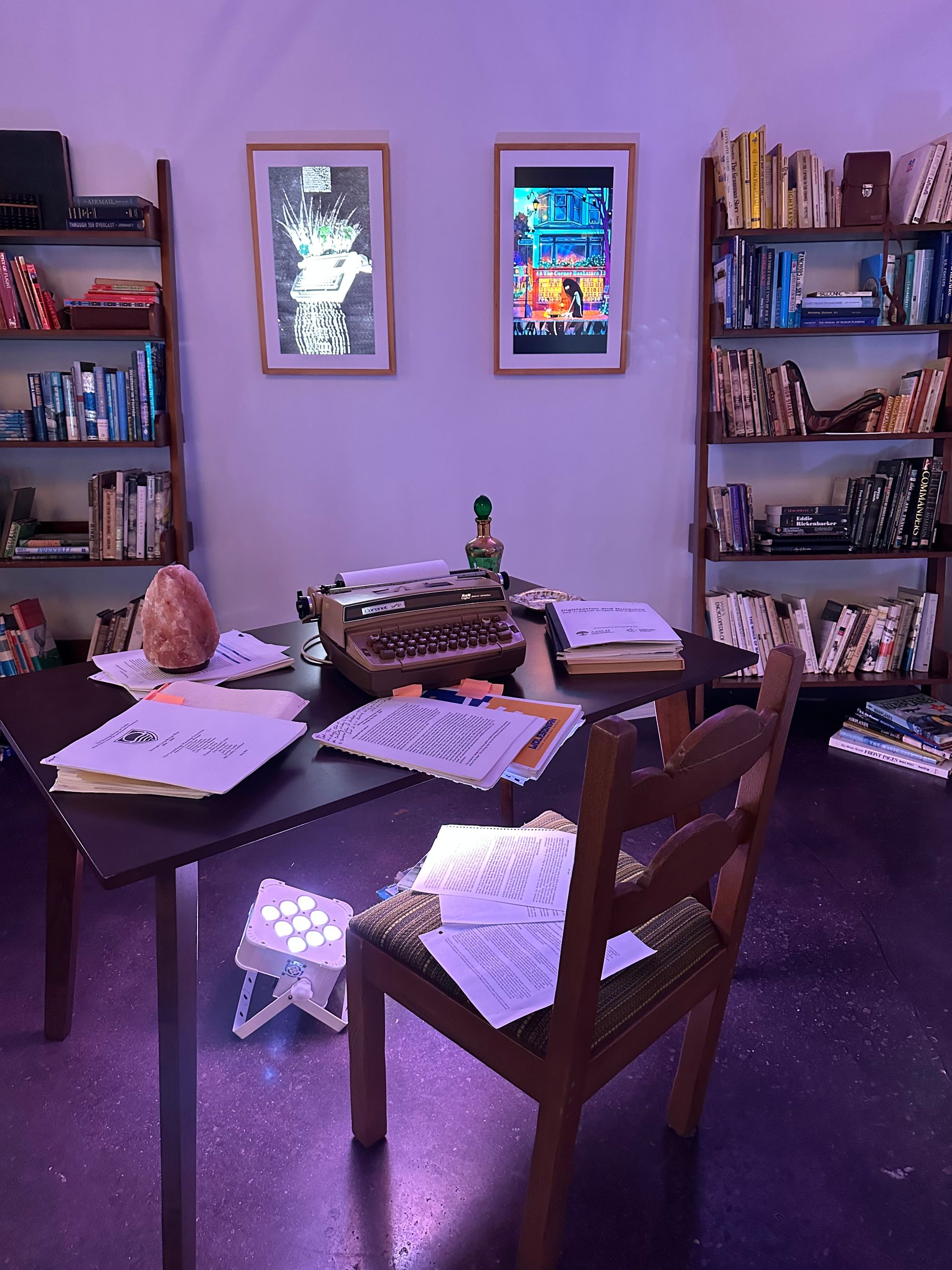 This library space, complete with a desk and typewriter, and scattered with books and papers, featured artwork from breakout series by Degen Poet and Laura El.