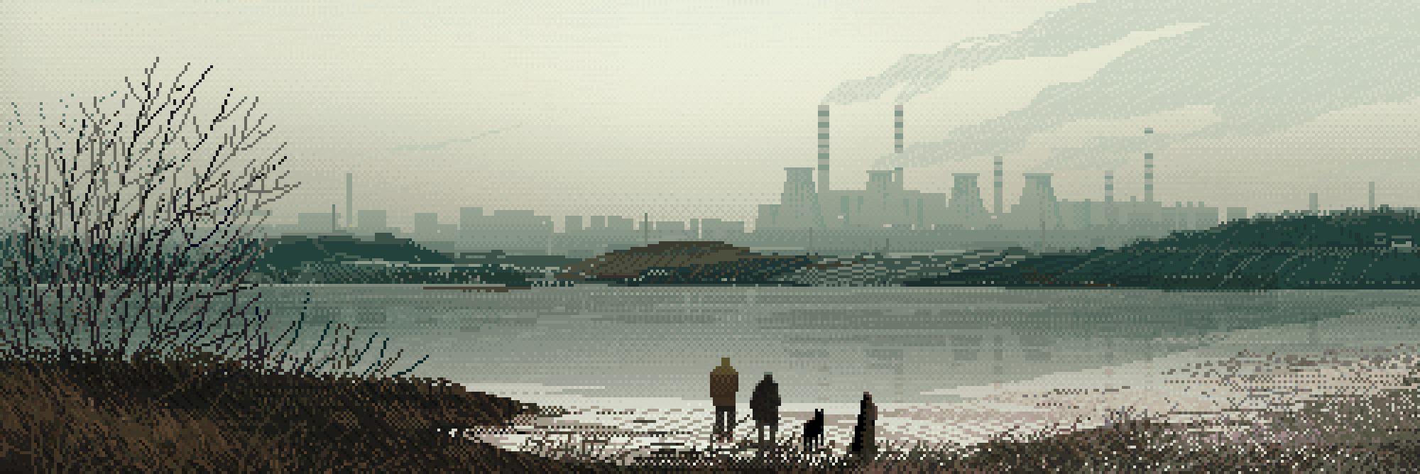 Pixel artist MEK rely on textures to convey different elements in landscapes. For example, the use of specific patterns and arrangements of pixels can depict grass, roads, trees, electronic elements or clouds.