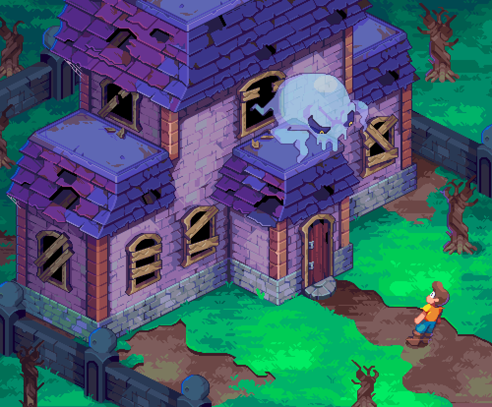 This pixel artwork is highly detailed despite the limited resolution. Artist use precise placement of pixels to create intricate natural scenes, architectural structures, and spooky environment.