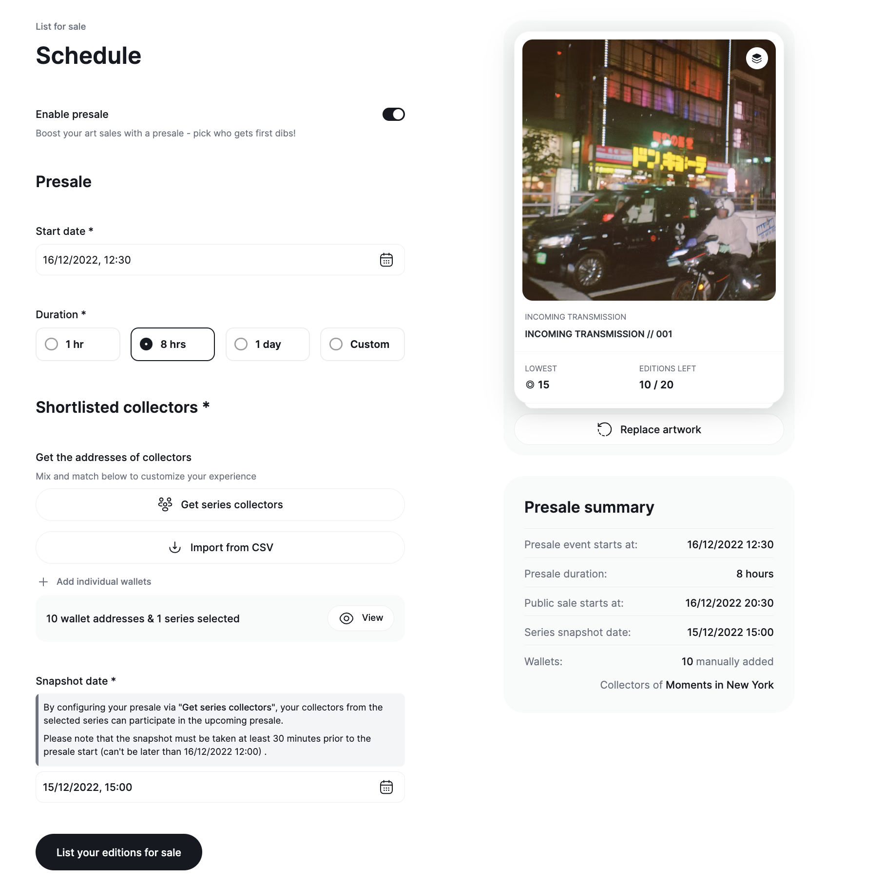 Whatever your use case is, Exchange.Art offers a friendly tool to whitelist collectors' wallets and offer them guaranteed access to acquire your new piece