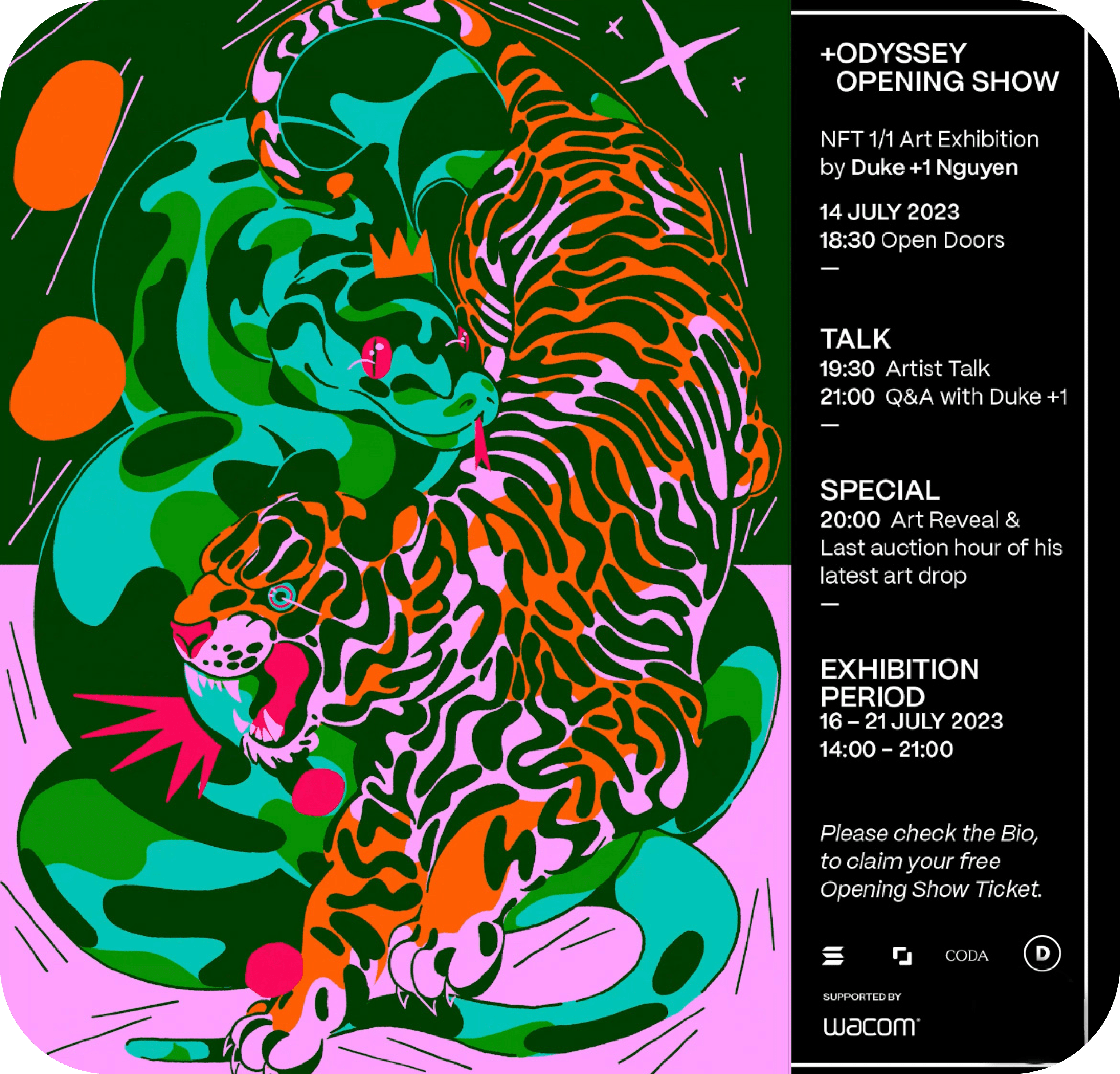Things get kicked off at the Wacom XP HQ in Düsseldorf on July 14th, 2023 with the +ODYSSEY OPENING SHOW, a night filled with community, panel talks, Q+A’s, and of course amazing art! Not only will this be Duke +1 first solo exhibition, but Duke also seeks to further create “one digital art community” and not have web3 and web2 feel like such separate worlds for digital creators.