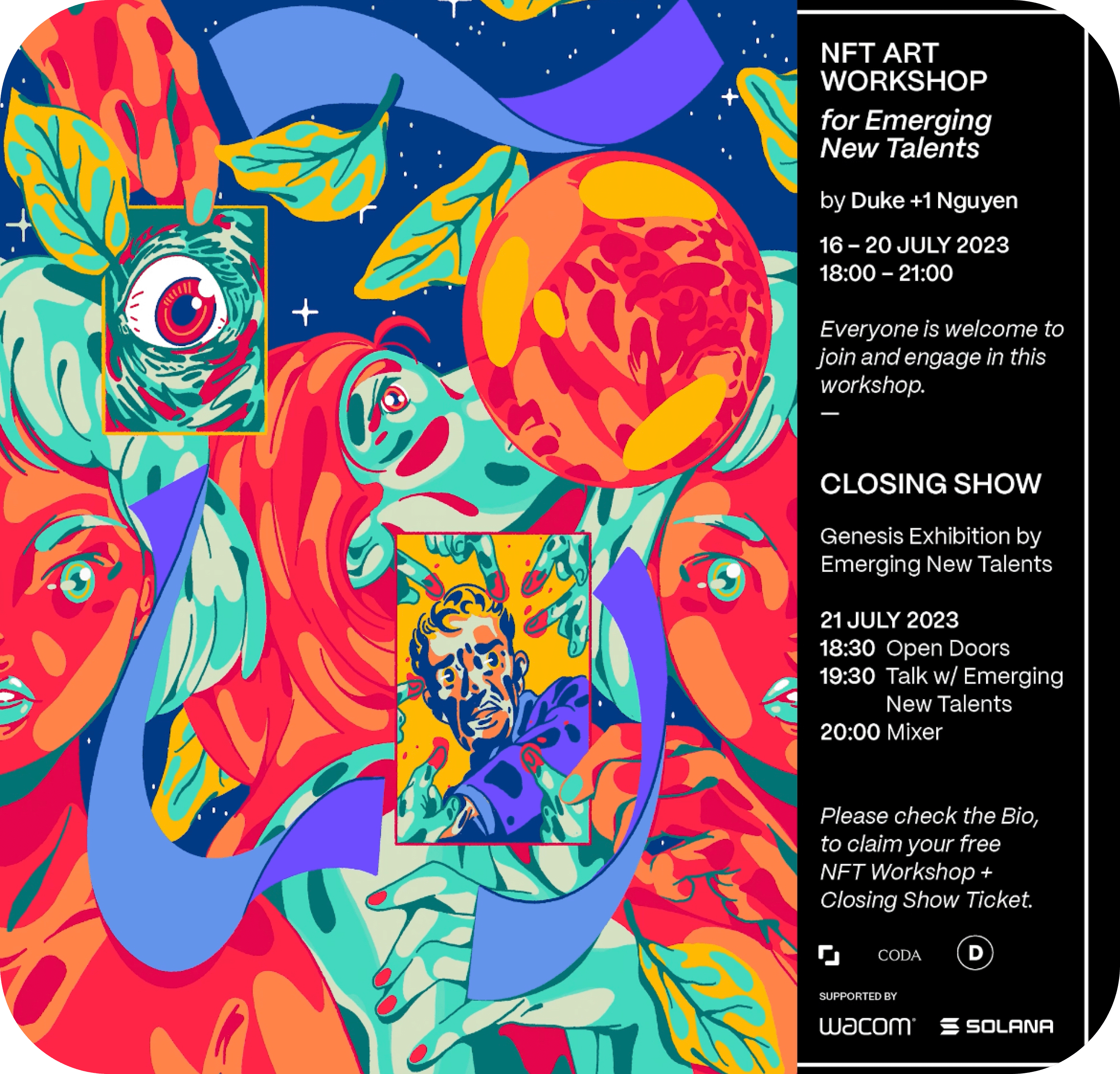 The exhibition will be on display, daily, July 16 - 20. The festivities don't stop there, alongside SuperTeamGermany, Duke +1, and Dr.Revel are hosting an NFT Workshop for curious creators and doing the important work of onboarding new talent to Solana through in-person conversations and showcases. At the end of the workshop, there will be a closing show which exhibits the talent onboarded through this program and showcases their genesis NFTs on Exchange Art!