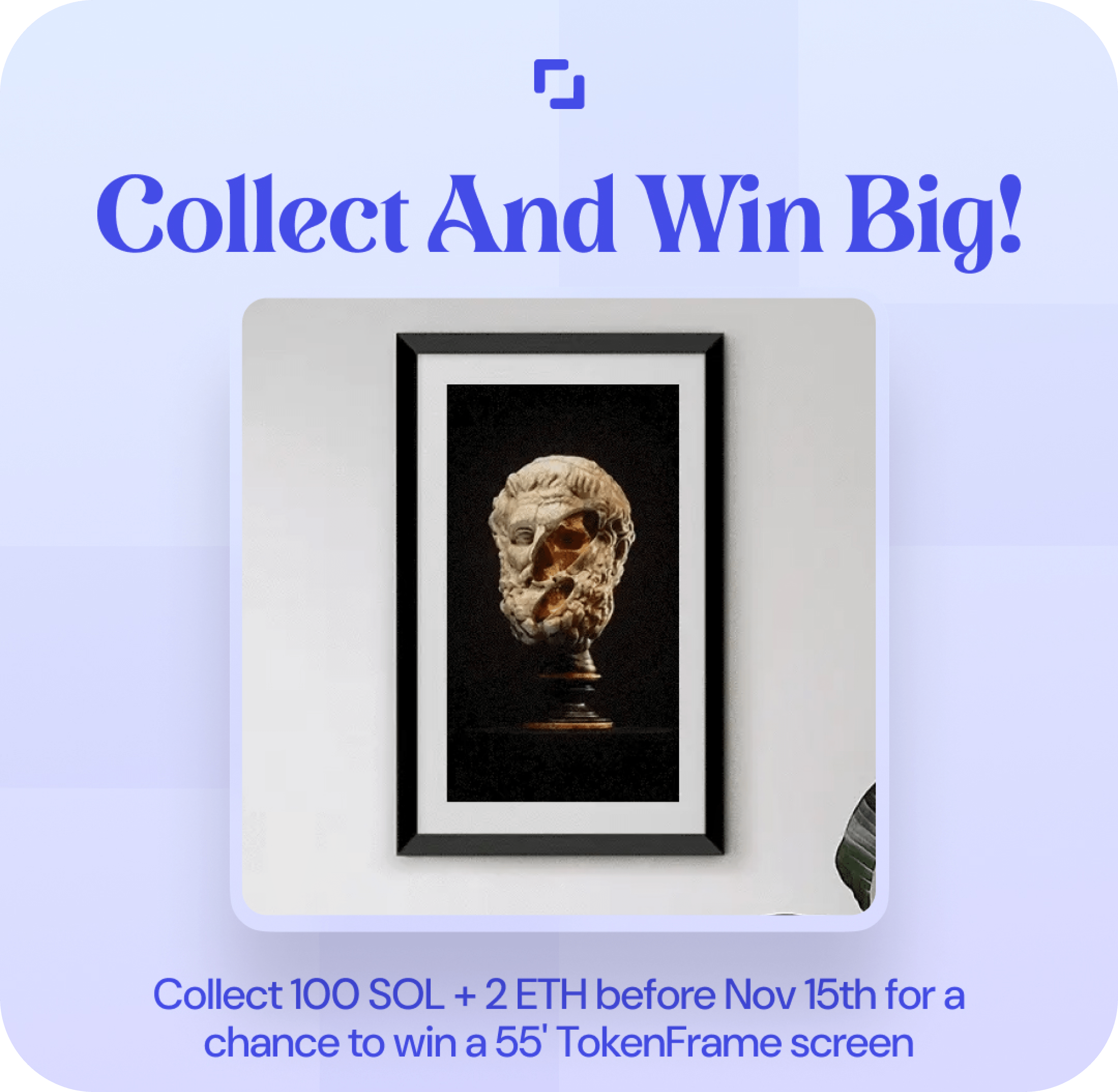What better way to give back to collectors than giving away a high-quality digital display! To further promote the creator economy and showcase multi-chain talent on Exchange Art; we want to stimulate collectors with a fun competition and a chance to level up their display game all whilst collecting amazing art! From now until November 15th, any collectors who meet the threshold of 100+ SOL & 2+ ETH collected on Exchange Art will be entered into a raffle for a chance to win a 55” TokenFrame screen! Good luck and happy collecting!