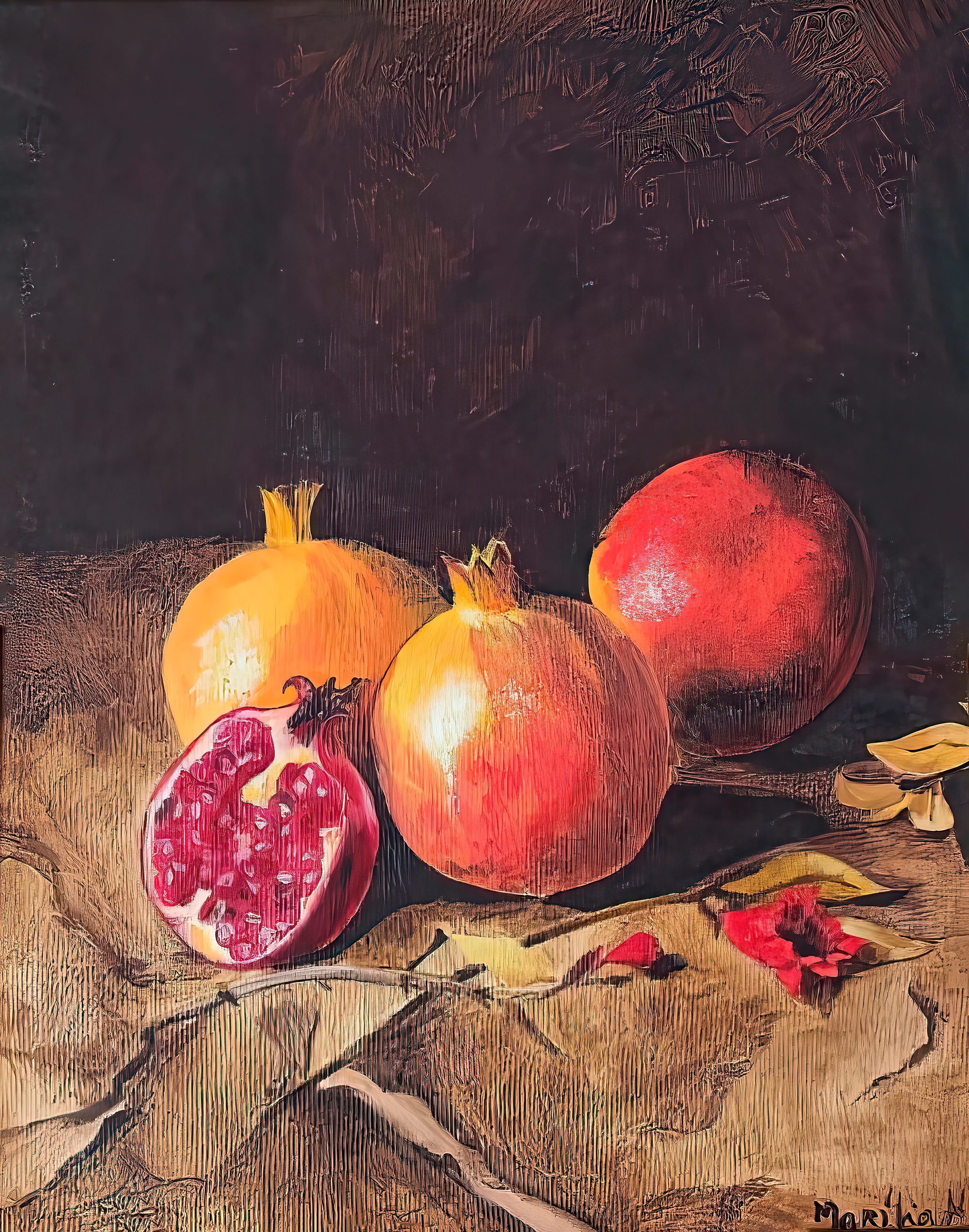 This artwork have a timeless quality, as the pomegranate depicted remain static and unchanging, capturing a moment that can be preserved indefinitely.